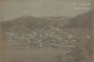 [Brésil]. [Dessin]. ROMIEUX (Osmond). [Rio janeiro (titre au crayon en bas à gauche)]. Dessin original, crayon sur fond en lavis de gris, rehauts de blanc. Env. 127 x 187 mm., signé O. Romieux en bas à droite, monté sur papier 168 x 220 mm.
