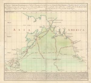 [Hawaï ; Océan Pacifique]. LOTTER (Tobias Conrad). Carte de l'Océan Pacifique au nord de l'équateur [...]. Augsbourg, Tobias Conrad Lotter, 1781. 1 carte gravée sur cuivre, 51 x 56 cm. (feuille), coloriée à la main (très légères saliss. dans les marges latérales). L’une des premières cartes gravées où Hawaï se trouve représentée. Rare carte du Pacifique Nord englobant les côtes de l’Asie et de l’Amérique, elle retrace les itinéraires du troisième voyage du capitaine Cook (1778), de Charles Clerke et des galions espagnols. Au sud, Hawaï apparaît sous le nom d’îles Sandwich, avec une note précisant qu’il s’agit du lieu du décès du capitaine Cook. Cet événement a servi de catalyseur à la publication de cette carte. En évoquant la visite d’un navire européen sur l’île, cette œuvre illustre un moment clé dans l’exploration des Amériques et du Pacifique. Selon le texte figurant au bas de la carte, celle-ci est basée sur une carte publiée dans le Gentleman’s Magazine en décembre 1780 et faisait partie d’un récit du troisième voyage de Cook publié en 1781. Il s’agit probablement du Journal of Captain Cook’s Last Voyage de John Rickman.