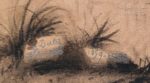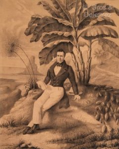 [Dessin]. [Antilles?]. Représentation d’un planteur, devant un palmier, à l’arrière-plan un paysage de bord de mer et montagneux. Crayon sur papier, 46 x 37 cm., contrecollé sur papier, sous marie-louise moderne (papier jauni). Ecole française XIXe siècle. Signé en bas à gauche Dutel (ou Dutet ?) 1859-1888 .