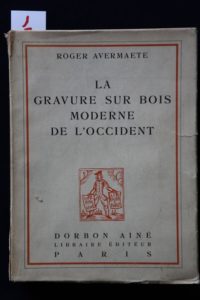 AVERMAETE (Roger)– La Gravure sur bois moderne de l'Occident. Ouvrage illustré de 239 gravures dont 177 bois originaux (230 en noir et 9 en couleurs). Paris, Dorbon Aîné, 1928. In-4° (20,5 x 27 cm) broché, couverture rempliée imprimée, un peu défraîchie, petite déchirure au sommet du dos, partiellement non coupé, de 331 pp.- 3 ff.. Tirage unique limité à 1000 exemplaires numérotés (n° 818), tous sur pur chiffon de Vincent Montgolfier spécialement fabriqué à cet effet et filigrané au ‘bouquineur’. Monographie dûe au critique d'art et dessinateur anversois Roger Avermaete (1893-1988) fondateur du groupe et de la revue Lumière (1919-1923). Elle est abondamment illustrée de bois dans le texte et à pleine page ; parmi eux, quelques bois ou linos originaux de Jozef et Jan-Frans Cantré, van Gindertael, Masereel, J. Minne, van Straten, Helena Bochořáková-Dittrichová ou Karel Němec, etc.