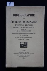 CLAUDIN (A.) PLACE (Joseph) – Bibliographie des éditions originales d'auteurs français des XVIe, XVIIe et XVIIIe siècles, réunies par M. A. ROCHEBILIÈRE. Rédigée avec des notes et des éclaircissements par A. Claudin et revue, corrigée et augmentée par Joseph Place. Paris, Éditions de la Chronique des Lettres Françaises aux Horizons de France 1930, in-8° (14,5 x 23 cm) broché de viii-297 pp.- 1f.. Édition originale tirée à 1.000 ex., un des 70 ex. de tête numéroté sur Vergé B.F.K. de Rives (n° 43). Bibliographie composée d'après le catalogue des ouvrages provenant du cabinet de feu M. A. Rochebilière, ancien Conservateur à la Bibliothèque Sainte-Geneviève, et dont la vente eut lieu le 31 mai 1882 et jours suivants. Collations et mentions de cartons précises.