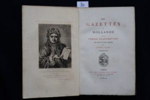 HATIN (Eugène) – Les Gazettes de Hollande et la presse clandestine aux XVIIe et XVIIIe s. Paris, René Pincebourde 1865. In-8° (15 x 22 cm) de 232 pp.- 1f. (Table). Relié pleine percaline marron (tachée). Édition originale, en grande partie non coupée, ornée en frontispice d'un portrait gravé à l'eau-forte par Ulm. Un des 100 ex. numérotés et justifié sur Hollande (n° 5). La seule bibliographie raisonnée et exhaustive des gazettes de langue française publiées en Hollande. Remarquable étude historique et bibliographique de cette presse française clandestine, dont l'importance pour l'histoire de la littérature est considérable. La bibliographie proprement dite décrit 94 gazettes, revues, petits journaux, avec pour chacun d'eux de très importants renseignements sur leur fondateurs et collaborateurs, spécialités, orientation, etc.