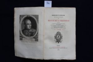 RESTIF DE LA BRETONNE - JACOB (P. L., Bibliophile) – Bibliographie et iconographie de tous les ouvrages de Restif de La Bretonne comprenant la description raisonnée des éditions originales, des réimpressions, des contrefaçons, des traductions, des imitations, etc. Y compris le détail des estampes et la notice sur la vie et les ouvrages de l'auteur par son ami Cubières Palmézeaux. Avec des notes historiques, critiques et littéraires. Paris, Auguste Fontaine 1875, fort in-8° (14 x 22,5 cm) broché non rogné, couv. imprimée légèrement défraîchie, de xv-510 pp. + 8 pp.- 2ff.. Portrait frontispice de Restif de La Bretonne dessiné par Binet et gravé par E. Loiselet d'après l'original de L. Berthe. Édition originale tirée à 500 ex. sur papier de Hollande (n° 91). Importante bibliographie décrivant minutieusement 63 titres ; elle est dotée d’une importante table analytique (42 pp.). En fin de vol. le catalogue des ouvrages de Restif de la Bretonne proposés par la Librairie Fontaine, soit toutes les œuvres séparément et deux séries quasi complètes de l’ensemble : une en 154 vol. reliée par Chambolle-Duru, une autre en 185 vol. reliée par David… UN RÊVE !