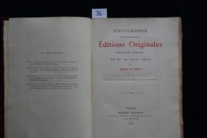 LE PETIT (Jules) – Bibliographie des principales éditions originales d'écrivains français du XVe au XVIIIe siècle. Ouvrage contenant environ 300 fac-similés de titres des livres décrits. Paris, Maison Quantin 1888, grand in-8° (19 x 27 cm) broché sous couverture de papier gaufré lie-de-vin à rabat, de 2ff.- vii-583 pp. (cette dernière mal chiffrée 383). Édition originale imprimée sur beau papier vergé à grandes marges, non rogné. Bon exemplaire malgré un dos fané. Première édition de cette précieuse bibliographie, due au bibliophile Jules Le Petit (1845-1915), qui décrit avec une précision minutieuse les grands classiques de la littérature française.