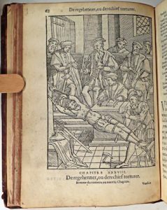 Édition originale de la traduction (éd. orig. en latin : 1554, traduction en néerl. : 1555, toutes deux par les mêmes éditeurs, antériorités des éditions contestées). Le texte, abrégé par rapport à l'édition en latin (soit 152 chapitres), est illustré des 56 mêmes bois à pleine page, sauf un, mais Damhouder s'en explique dans son avis au lecteur : "[c'est] la tardiveté & paresse des peinctres, & tailleurs, [qui] m'ont contrainct d'abbrévier, & délaisser telles figures". C'est le premier traité sur le droit criminel et les procédures à suivre paru en Europe, et un des plus beaux jamais illustré. Les bois représentent différents délits criminels et les supplices qui les punissent : adultère, inceste, vol, viol, assassinat, etc. • Rare édition le texte ayant souvent été réédité en latin ou néerlandais, plus rarement en français. # BB II-25; # Biogr. nat. V-61/66; # pas dans Machiels ni Adams.