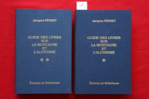 PERRET (Jacques) – Guide des livres sur la montagne et l’Alpinisme. Grenoble, Éditions de Belledonne 1997, 2 vols. in-8° (25 x 17 cm) de 572p.-1f. + 573p.-2ff. en reliures éditeur pleine toile bleue, titres dorés. Préface de Paul Guichonnet. Le tome 1 est un classement des œuvres par nature : chrono, lieux, collections… Le tome 2 est le dictionnaire proprement dit avec un classement par ordre alphabétique des auteurs et pour les plus importants une courte biographie. Édition originale numérotée (n°179). État neuf.