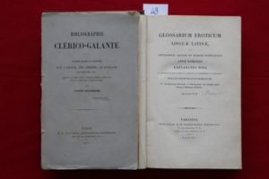 [PIERRUGUES (Pierre)] – Glossarium eroticum linguæ latinæ, sive Theogoniæ, legum et morum nuptialium apud Romanos explanatio nova. Ex interpretatione propria et impropria et differentiis in significatu fere duorum millium sermonum, Ad intelligentiamPoetarum et Ethologorum tam antiquae quam integrae in fimaeque latinitatis ; Auctore P. P. Parisiis, apud Aug.-Fr. et Pr. Dondey-Dupré Bibliopolas 1826, in-8° (16 x 23,5 cm) de 3 ff.- 520 pp. [1 à 464 et 463 à 518] imprimées sur vélin fort. Relié demi-chagrin rouge grenat à coins, dos à nerfs et caissons de filets à froid, tête dorée. (Armoiries en queue effacées, non rogné). Édition originale de ce glossaire érotique du latin antique, empruntant ses exemples aux textes littéraires et juridiques. Réf. : Barbier IV-1266, Pia 585, Quérard, La France littéraire VII-157, cet ouvrage on ne peut plus curieux « donne l’explication des mots techniques de la jurisprudence et de la médecine, qui tiennent aux mœurs, à la physiologie et aux lois du temps, de ces expressions figurées en usage dans la classe élevée des Romains, enfin de ce langage populaire qui n’est devenu licencieux que dans les livres modernes… Rien n’a été négligé pour rendre ce Glossaire digne d’occuper un rang distingué parmi les meilleurs ouvrages classiques ». On joint : [LAPORTE (Antoine)] – Bibliographie clérico-galante. Ouvrages galants ou singuliers sur l'amour, les femmes, le mariage, le théâtre. etc. Écrits par des Abbés, Prêtres, Chanoines, Religieux, Religieuses, Évêques, Archevêques, Cardinaux et Papes. Paris, M.-A. Laporte 1879, in-8° br. (14 x 23 cm), de xxviii-178 pp.. (dos cassé, couverture imprimée détachée). Rare bibliographie qui traite des histoires de moines vicieux et autres défroqués écrit par le bouquiniste bibliographe Antoine Laporte.