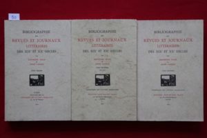 PLACE (Jean-Michel) VASSEUR (André) - Bibliographie des revues et journaux littéraires des XIXe et XXe siècles. Paris, l’auteur 1973-77, 3 vols. in-8° (16,5 x 25,5 cm) br., non coupés. État neuf. Importante publication fondée sur la collection du bibliophile André Vasseur qui rassemblait près de 12.000 titres. Notices scrupuleuses avec à la fin du tome 3 un important index qui recense quelque 35.000 noms … pour découvrir et connaître ces revues, véritables laboratoires de la création littéraire et artistique.