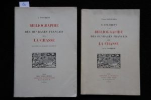 [CHASSE] - THIÉBAUD (Jules) – Bibliographie des ouvrages français sur la chasse, illustrée de quarante fac-similés. Paris, Émile Nourry, Librairie Cynégétique 1934, in-4° br. (19,5 x 28,5 cm) couverture illustrée, de xii-1040 colonnes -1f. (justification). Première édition tirée à 1050 ex., un des 1000 ex. num. sur Alfa satiné. Prospectus joints. On joint, qui fait suite : MOUCHON (Pierre) – Supplément à la Bibliographie des ouvrages français sur la chasse… Paris, Librairie J. Thiébaud 1953, in-4° br. (19,5 x 28,5 cm) couverture illustrée, de xvi-1041 à 1360 colonnes -1f. (justification). Première édition tirée à 850 ex., un des 800 ex. num. sur Alfa satiné. LA référence !
