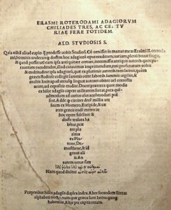 ERASMUS, Desiderius.- Adagiorum chiliades tres, ac centuriae fere totidem [...]. (Tubingae, in aedibus Thomae Anshelmi Badensis, impensis providi viri Lodovici Hornecken, 1514. Mense martio). In-f° : [26]-249-[1 bl.] lvs (tears repaired whom one on...