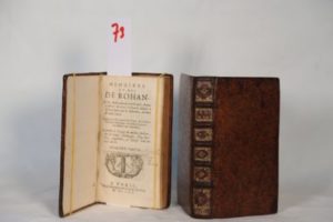 ROHAN (Henri de) – Mémoires du Duc de Rohan, sur les choses advenuës en France, depuis la mort de Henry le Grand, jusques à la Paix faite avec les Réformez, au mois de juin 1629. Augmentez d’un quatrième livre, de divers Discours Politiques du mesme autheur, cy-devant non imprimez. Ensemble le Voyage du mesme autheur fait en Italie, Allemagne, Pays-Bas Uni, Angleterre, Ecosse. Fait en l’an 1600. Première partie. Suivi de : [ROHAN (Henri de)] – Véritable discours de ce qui s’est passé en l’Assemblée Politique des Eglises Réformées de France tenuë à Saumur, par la Permission du Roy l’an 1611. Servant de Supplément aux Mémoires du Duc de Rohan. Seconde partie. Paris, Compagnie des Libraires du Palais 1665, 2 vols. in-16 (9 x 15 cm) de 4ff.- 352 pp + 1f.- 382 pp., reliés plein veau brun, dos à nerfs et caissons fleuronnés, roulettes sur coupes, tranches mouchetées. (Habiles petites restaurations). Bons ex. dans une sobre reliure du temps.