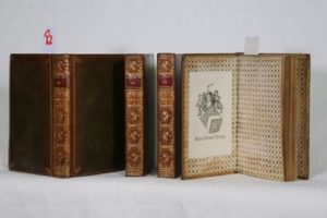 BOILEAU DESPRÉAUX (Nicolas) — Œuvres… avec des éclaircissemens historiques donnez par lui-même. Nouvelle édition revuë, corrigée augmentée. Enrichie de figures gravées par Bernard Picart le Romain. La Haye, Isaac Vaillant, Pierre Gosse Pierre de Hondt, 1722. 4 vols. in-12 (16,7 x 10,1 cm), de Frontispice 2f.- xlvi-1f.-436 pp. ; viii-407 pp. 6 planches hors texte illustrant le Lutrin, réduction de celles de l'édition de 1718 ; 2f.-407 pp. ; 2f.-308 pp. 1 pl. dépliante représentant les armoiries de Guillaume de Lamoignon. Illustré de 33 culs-de-lampe et vignettes par le talentueux Bernard Picart. Reliures d’époque plein maroquin vert bronze, dos lisses insolés ornés de filets or formant caissons fleuronnés, pièces de titre et de tomaison rouge et beige, triple encadrement de filets or avec fleurons d’angle sur les plats, filet sur coupes, gardes de papier dominoté gaufré composé d’un semis d’étoiles et de points dorés alternés sur fond blanc, tranches dorées. Beaux volumes. Ex-libris armorié gravé d’Arthur Howard Southey (1839-1915) avec au tome II celui de William Howard (1774-1860) à Hartley House Devon contresigné par A. Howard Southey son petit-fils. Réf. : Brunet I-1058 : « Jolie édition dont on ne trouve pas facilement de beaux exemplaires », Cohen 167 : « Jolie édition », Graesse I-472.
