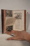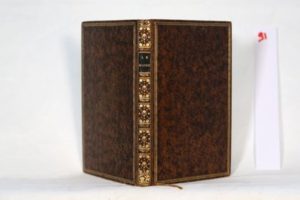 [CURIOSA] — Le Bijou de Société ou l'Amusement des Grâces. Entremêlé avec — Le Joujou des Demoiselles., soit : [Anonyme] — Le Bijou de Société, ou L’Amusement des Grâces. Paphos, L'an des Plaisirs, s.d. (Paris, vers 1784). Collationné de 96 gravures sur 100, et numérotées de I à CI, avec une épigramme en regard mais pour les épigrammes XXXII et XXXIII, il n'y a eu qu'une seule figure, (il manque 4 textes-gravures : XCIII à XCVI). Ouvrage entièrement gravé. (Une page de titre remontée). Chaque feuillet contient une épigramme badine ou un petit conte facétieux ou libertin, qui figuraient dans ‘La légende joyeuse, ou les cent-une leçons de Lampsaque (1749), et le ‘Cabinet de Lampsaque’ (1784). Les gravures sont de Brichet d'après des dessins attribués à Claude-Louis Desrais. Le livre a été condamné en 1815. Entremêlé avec : [JOUFFREAU DE LAZARIE] — Le Joujou des demoiselles. S. l. n. d. [1753]. Ouvrage entièrement gravé, collationné de 53 feuilles gravées comportant chacune une vignette non signée et une ou deux épigrammes érotiques. « Seconde édition de ce recueil de poésies licencieuses attribuées à l'abbé Jouffreau de Lazarie, illustrées vignettes en tête de page. Le texte a été entièrement gravé. Plusieurs vignettes ont été modifiées par rapport à l'édition précédente, des personnages ayant été remplacés par des paysages » Cohen 521. Reliure : Les deux recueils sont bien assemblés et de bien curieuse manière. Le relieur a collé au verso de chaque feuillet sur vergé tiré du ‘Joujou’ deux gravures accompagnées du texte, placées dans le travers, la hauteur d’un feuillet du ‘Bijou’ correspondant à la largeur d’un feuillet du ‘Joujou’. Le texte se plaçant naturellement au milieu des deux gravures, son recto en regard de la gravure de gauche, et tournant la page, le verso regarde la gravure de droite ; l’ensemble dans l’ordre numérique. Cet astucieux travail est exécuté au XIXe siècle en un volume in-8° (20 x 13 cm) plein veau brun jaspé, dos à nerfs orné de filets et caissons fleuronnés dans le goût du XVIIIe, triple encadrement de filets or sur les plats, filet sur coupes, roulette intérieure sur chasse, gardes papier coquille, tranches peintes. Bel exemplaire original et séduisant. Réf. : Dutel A-148 583., Gay-Lemonnier II-730 I-400 « les gravures (attribuées à Desrais) ne sont pas libres, mais elles sont assez originales… », Pia 121 649, et Ed. de Goncourt, dans La Maison d’un Artiste : « …Et n'oublions pas encore les méchants vers badins du ‘Joujou des demoiselles’, aux deux titres dessinés par Eisen, et dont chaque page a un en-tête gravé ; et les méchants vers polissons du ‘Bijou de Société ou l’Amusement des Grâces’, À Paphos, l’An des plaisirs : petits volumes au texte gravé… », les voici par bonheur réunis, tous deux entremêlés.