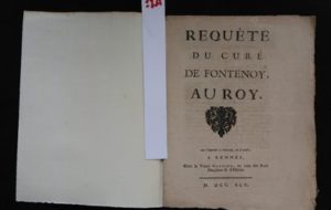 [MARCHAND (J.-H.)] – Requête du curé de Fontenoy, au Roy. Sur l’imprimé de Fontenoy, se vend, à Rennes, Chez la Vve Garnier, au coin des ruës Dauphine et d’Estrée 1745, brochure in-4° (17,5 x 23 cm) à toutes marges de 8 pp.. Requête en vers peu commune. La même année, J.-B. Carsillier publia une ‘Requête au Roy pour le curé d’Antonin contre le curé de Fontenoy (Gand, Jean Cantat 1745, in-4°, 8 pp.). Requête en vers qui est une réponse tout aussi spirituelle à la précédente. Réf. : Barbier IV-328c.