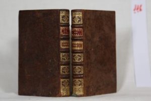 MONTCHAL (Charles de) — Mémoires de… contenant les particularitez de la vie et du ministère du Cardinal de Richelieu. Rotterdam, Gaspard Fritsch 1718, 2 vols in-12 (16,2 x 10,2 cm) de 1f.-750 pp. à pagination continue. Titre en rouge et noir avec vignette gravée figurant un esprit aérien laissant tomber de sa corne d’abondance des livres sur Terre. Reliures d’époque pleine basane brune, dos à nerfs ornés de larges fleurons, pièces de titre et tomaison rouge et beige, roulette sur coupes, gardes coquille, tranches peintes. (Petites usures angulaires d’usage et quelques ff. brunis). Édition originale de ces mémoires anti-absolutistes, qui vont de 1624 à 1641, et se montrent très opposés à la politique religieuse de Richelieu qui regardait les revenus du clergé comme une ressource de l’État. Curieux détails sur l’assemblée générale du clergé de Mantes en 1641 d’où Montchal fut exclu. Réf. : Bourgeois André 726, Cioranescu 49962.