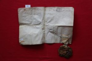 Parchemin du XVIIIe siècle – [BRETAGNE] – 18 février 1719. Pièce de parchemin (39,5 x 27,5 cm) avec un important reste de sceau (11 x 9 cm). Réception de Jean RICHEUX ajusteur des monnaies par André BOUCHER, écuyer, seigneur du fief Bernard, conseiller du Roi et général provincial des monnaies.