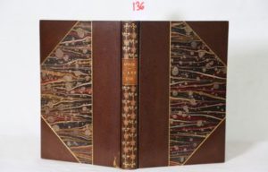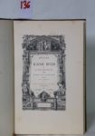 APULÉ – L'Âne d'Or ou La Métamorphose. Traduction de SAVALÈTE. Préface de J. Andrieux. Avec nombreuses gravures dessinées par A. RACINET et P. BÉNARD. Livres I à VI avec l'histoire de Psyché. Paris, Firmin-Didot 1869-1872, grand in-8° (18 x 25,5 cm) de 2ff.- v-180 pp. ornées de frises décoratives en encadrement et de 96 compositions dont 17 à pleine page, rousseurs éparses. Reliure du temps à la Bradel demi-maroquin ganache à larges coins surlignés de filets or, dos orné d’une guirlande de feuilles et fleurs rouges mosaïquées, pièce de titre basane havane, tête dorée, la fragile couverture de papier glacé conservée. Bel exemplaire dans une jolie reliure de Ch. MEUNIER. Réf. : Carteret III-35, Vicaire I-75 : Premier tirage, sans les cartons aux pages 38, 43 74, gravures remplaçant les passages supprimés, censurés. Exemplaire avec la couverture blanche glacée à la date de 1869, page de titre de relais datée 1872. Deux ex-libris : ‘J. Recorbet’ et ‘J.P.N.’, ce dernier gravé sur bois par Stern.