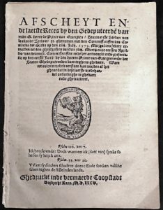 volcommelick verstaen kan worden al het ghene dat in deze laetste vredehandel onderlinghe is ghedaen ende ghetracteert. Dordrecht, [Jean Canin], 1575. In-4° : [22] pp. In losse katernen.