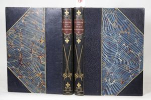 DUMAS (Alexandre) – Les Trois Mousquetaires. Avec une lettre d'Alexandre Dumas Fils. Compositions de Maurice Leloir gravures sur bois de J. Huyot. Paris, Calmann Lévy 1894 (novembre 1893), 2 vols in-4° (20,7 x 30,3 cm) de xx-479 + 469 pp.. Reliure d’époque demi-maroquin bleu nuit à coins, dos lisses ornés d’un décor parlant fait d’épées et de fleurs de lys, pièces de titre marron, tête dorée. Couvertures conservées. Reliure signée de Durvand. Beaux exemplaires, sans rousseurs. Réf. : Vicaire III-360. Lucien Durvand (1852-1924) établi rue du Pré-aux-Clercs à Paris est un des meilleurs relieurs de son époque ; il reçut la médaille d'argent à l'exposition universelle de 1900.
