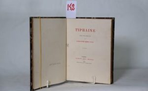 [DUMAS fils (Alexandre)] – Tiphaine. Avec une préface par Alexandre Dumas fils. Paris, Calmann Levy 1880, petit in-8° carré (14 x 18,5 cm) de 2ff.- vii-103 pp.. Reliure demi-chagrin tête de nègre, dos à nerfs, gardes peignées. Édition originale. Bon ex.. Réf. : Talvart Place V-79, Vicaire II-504. La préface d'Alexandre Dumas fils indique que le roman est de source anonyme mais il a été attribué à Benjamin BARBÉ (1818-1893) qui a participé à la Révolution de février 1848 et construit le Château Barbé à Capvern-les-Bains dans les Hautes-Pyrénées.