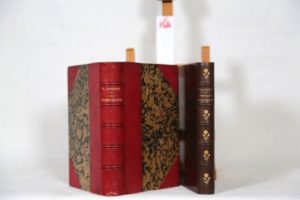 GAUTIER (Théophile) – Les Jeunes-France. Romans goguenards. Suivis de Contes humoristiques. Paris, Charpentier et Cie, 1873, in-12 (13 x 19 cm) de 2 ff.-, xviii-1f.- 369 pp.- 1f. [table]. Un des 50 exemplaires du tirage de tête sur Hollande, seul grand papier, celui-ci le n° 35. Reliure demi-maroquin cerise à coins, dos à nerfs, date en queue, tête dorée, non rogné. Séduisant exemplaire dans sa reliure d’époque signé ‘Pierson’ (relieur attitré des frères Goncourt, établi à Paris, 30 rue Mazarine). Réf. : Clouzot 124 « Édition la plus complète, avec un texte conforme à la première édition ». Édition définitive du texte, paru en 1833. Les Jeunes-France est le premier recueil de nouvelles publié par Théophile Gautier. « L’éditeur Charpentier donna une édition définitive de cet ouvrage, dont la publication en France avait été interdite pendant toute la durée du second Empire. Celle-ci, pour la première fois , est conforme à l’édition originale ». Édition en partie originale augmentée de récits publiés entre 1831 et 1844, sous le titre de Contes humoristiques : La Cafetière, conte fantastique, Laquelle des deux, histoire perplexe, L’Âme de la maison, conte, Le Garde National réfractaire, Deux Acteurs pour un rôle, conte, Une Visite nocturne, Feuillets de l’album d’un jeune rapin, et De l’Obésité en littérature. On joint : GAUTIER (Théophile) – Portraits contemporains. Littérateurs, Peintres, Sculpteurs, Artistes dramatiques. Un portrait de Théophile Gautier d'après une gravure à l'eau-forte par lui-même vers 1833. Paris, Charpentier et Cie 1874, in-12 (12,5 x 19 cm) de 2ff.- 464 pp. et un portrait front. imp. sur Vergé. Relié demi-chagrin marron, dos à nerfs fleuronné, tête dorée. Édition originale. Réf. : Vicaire III-939. Les 59 études de ce recueil ont été publiées dans divers journaux parisiens de 1839 à 1867. Réunies juste après la mort de l'écrivain, elles concernent notamment Théophile Gautier par lui-même, Balzac, Baudelaire, Granville, Ingres, Delacroix ainsi que les grandes actrices du temps : Mlle Georges, Mlle Juliette, Mme Dorval, Mlle Mars, Rachel…