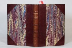 NÉGRIN Émile – Les Contes Gaulois. Turin, s.n., 1866, in-8° (19 x 13,3 cm) de 324 pp. avec un portrait gravé par Laly d’après une photographie de Serène Lemière (photographe niçois). Reliure d’époque demi-chagrin prune à coins, gardes de papier peigné assorti, dos à nerfs, tête dorée. Édition originale, tirage limité à 169 exemplaires sur papier bistre (n° 50), selon les indications précises de l'artiste, conformément au colophon. Peu de documents sur ce sémillant littérateur provençal. On se réfère à la note de la ‘Biographie Nationale des Contemporains’ (E. Glaeser) : « Émile NÉGRIN né à Cannes d'une famille de notaires, le 14 octobre 1833… Fut successivement professeur à Bagnères-de-Luchon, rédacteur de l’Union des Artistes, puis du Courrier des artistes à Toulouse et correcteur à Paris. Greffier du tribunal civil à Nice en 1861, il perdit ce dernier emploi à la suite d'un procès de presse… Sa qualité de romanisant et ses travaux sur l'orthographe provençale l'ont lié d'amitié avec MM. Mistral, Aubanel, etc. …. Sa poésie est claire comme de la prose, et sa prose colorée comme de la poésie. En 1872, dans la force de l'âge et du talent, il est frappé à la fois de cécité et de paralysie » (et, jeune, décède à Nice en 1878, à 45 ans). Édition peu commune qui a la particularité d’avoir les huit dernières pages vierges, titrées en tête : « Actes de transmission du présent exemplaire » … sans doute une réminiscence de Greffier !