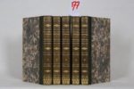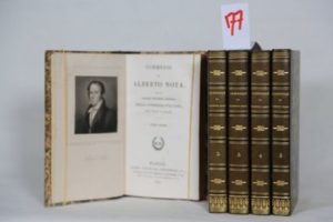 [Italie] - NOTA Alberto – Commedie di Alberto Nota, con un saggio storico critico della commedia italiana, del prof. F. SALFI. Paris, Baudry 1829 (Crapelet imp.), 5 vols. in-12 (18 x 11 cm) avec un portrait frontispice de l’auteur par P. Ammirati, gravé par Hopwood. Reliures d’époque demi-basane vert olive, dos orné de filets à froid bordés d’un double rang de filets or, palmettes effilées entre ; gardes marbrées, tranches mouchetées et cirées. Exemplaires séduisants, agréablement imprimés, dans d’élégantes reliures. Première édition parisienne, enrichie de l’importante réplique sur la comédie italienne (144 pp. datées du 15 avril 1829) de Francesco Salfi à la querelle avec Chauvet qui est alors le représentant le plus significatif de la littérature italienne en France. Réf. : Brunet IV-109, Quérard VIII-400, Renzi ‘Vie politique et littéraire de F. Salfi’.