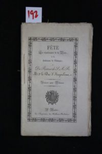 [ESPAGNE] - Louis Antoine D’ARTOIS, duc d’Angoulême – Fête en réjouissance de la paix, de la délivrance de l’Espagne, et du retour de S. A. R. Mgr le duc d’Angoulême. Nantes, Imp. de Mellinet-Malassis 1823. Plaquette in-8° (14 x 22 cm) couverture imprimée, de 54 pp.- 1f., en feuilles cousues en marge non rognées. Très belle condition. Rare. « En avril 1823, pour rétablir le roi Ferdinand VII sur son trône, un corps expéditionnaire est envoyé par Louis XVIII. Les troupes, placées sous le commandement de son neveu le duc d'Angoulême, franchissent les Pyrénées et s'emparent de Madrid… ».