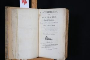 [BERTIN (Théodore-Pierre)] – La Comiphonie, ou les femmes dans le délire. Ouvrage enrichi d’une gravure en taille-douce. Par F. L. MISETHOS. Paris, Chez Debray libraire, de l'imprimerie de Gille, An XI-1803 ; in-12 (18 x 11,5 cm) de 2 ff.-146 pp.. Le frontispice manque. Reliure postérieure, pastiche XVIIIe, pleine basane marbrée bronze, dos lisse orné de caisson fleuronnés, triple encadrement de filets or avec fleurons d’angle, au centre les armoiries de Marie-Thérèse de Savoie, épouse du comte d’Artois. Édition originale de ce curieux traité sur la chevelure des femmes. Ex. bien relié qui porte l’étiquette du relieur-doreur angevin Legal-Thiberge. Réf. : Quérard-Supercheries II-1167, Gay-Lemonnyer I-633. « L’ouvrage se présente sous la forme d'une séance extraordinaire des dieux tenue sur le mont Olympe ; Minos en est le président. Stentor l'amant Psyché prend la parole et part dans une diatribe qui défend qu'une "tête sans cheveux est une rose effeuillée" ; puis c'est une exposition des vues des déesses, reines, princesses concernant leurs cheveux : "Qu'y a-t-il, en effet, de plus ravissant que les longs flots d'une chevelure d'ébène, agitée par le Zéphir, formant un rideau sur les épaules de Cypris ?"… Ce texte est aujourd'hui devenu difficile à trouver. Quant à son titre ‘Comiphonie’, ce néologisme n'a été repris par aucun dictionnaire ; étymologiquement le mot comète vient du grec ancien Κομήτης ‘komêtês’ qui signifie chevelu et de φωνή ‘phone’ qui est voix, soit : "discussion sur/autour la chevelure" … Théodore-Pierre Bertin (1751-1819) est aussi l'inventeur du renouveau de la sténographie en France » (d’ap. Le Bibliomane Moderne).