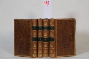 [CHINE] – BRETON DE LA MARTINIÈRE (Jean-Baptiste) – La Chine en miniature, ou choix de costumes, arts et métiers de cet empire. Paris, Nepveu 1811, 4 vols. in-18° (14 x 9 cm) illustrés de 77 figures hors-texte en coloris d’époque montrant des costumes et des scènes pittoresques ou curieuses. Rel. d’époque pleine basane mouchetée, dos lisses ornés de 4 jonques avec pièces de titre et tomaison vert bronze sur chaque volume, encadrement de roulette sur les plats, toutes tranches dorées, filet sur coupes. Usure au pied du tome 3. Première édition de cette encyclopédie miniature sur la Chine. Les illustrations furent gravées d’après les originaux inédits de la collection du ministre d’État et contrôleur général des finances de Louis XV, Henri BERTIN (1720-1792) passionné par la Chine. Bons exemplaires dont les gravures, protégées sous serpentes, ont des coloris très frais. Réf. : Brunet I-1225, Colas 433, Cordier (Sinica) I-64, Quérard I-505.
