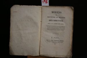 CADET de VAUX (Antoine-Alexis) – Moyens de prévenir le retour des Disettes. Paris, chez D. Colas 1812, in-8° broché, sous couverture d'attente bleue de l'époque de viij-239 pp.. (Petits défauts). Édition originale. Pharmacien chimiste, inventeur, fondateur du premier journal quotidien (Le Journal de Paris, 1777), Cadet de Vaux (1743-1828) était également un philanthrope soucieux du bien être de chacun, d'où sa souffrance pour tout ce qui avait trait à l'hygiène et à la santé publique, à la qualité des aliments. En 1780, il créait à Paris la première école de boulangerie. Réf. : Kress S 6013.