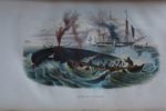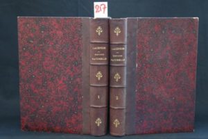 LACÉPÈDE (Bernard de) TRAVIÈS (Édouard) – Histoire naturelle de Lacépède comprenant les cétacés, les quadrupèdes ovipares, les serpents et les poissons. Nouvelle édition précédée de l'éloge de Lacépède par Cuvier, avec des notes et la nouvelle classification de A.-G. Desmarest. Paris, Furne et Cie. 1855, 2 vols. gr. in-8° (18,5 x 27 cm) de xii- 668 et 647 pp. imprimées sur 2 colonnes. Illustrés de 36 planches hors-texte par Édouard Traviès, coloriées et gommées, complet. Reliure du temps demi-chagrin brun chocolat, dos à nerfs fleuronné, tranches mouchetées, petite usure en tête. Bons exemplaires. (Rares rousseurs).