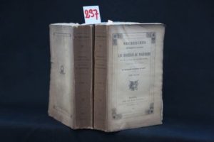 SAINTE-CROIX (M. le Bn Guilhem de) – Recherches historiques et critiques sur les mystères du Paganisme. Seconde édition, revue et corrigée par M. le Baron SYLVESTRE DE SACY. Paris, De Bure Frères, 1817, deux vols. in-8° br. couvertures imprimées (14 x 21 cm), dos brunis, de lxviii-472 p. 2 ff.-111+349 pp. et 2 grandes pl. dépliantes. Mystères cabiriques, Mystères éleusiniens, Fêtes mystérieuses de Cérès et Proserpine, Mystères de Bacchus, Mystères de Vénus et d’Adonis, etc. Cette seconde édition est complète de ses 2 cartes dépliantes ‘Plan d'Éleusis’ et ‘Plan des ruines du temple de Cérès à Éleusis’, ainsi que le ‘De triplici theologia mysteriisque veterum commentatio’ de J. d'ANSSE DE VILLOISON (111 pp.) avec une pagination séparée de façon « qu’il pût même être détaché de cette seconde édition ».