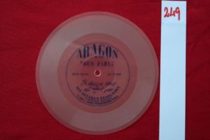 ARAGON (Louis) – ‘Aragon vous parle’. Paris, Les Lettres Françaises 1959, disque souple microsillon de 45 tours ( 17,5 cm.), protégé par une pochette de papier cristal, avec la mention : ‘Ce disque vous est offert par Les Lettres Françaises, directeur Aragon’. Inséré dans le n° 739 du 17 décembre 1959 de la revue France Nouvelle. Bon état, peu commun. Réf. : BnF « Réclames à la BnF ! Collection de 1300 disques publicitaires. Le disque le plus ancien est un disque souple mono-face à caractère littéraire : ‘Aragon vous parle’».