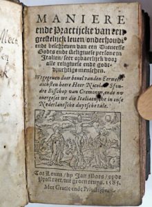 Tweede (?) uitgave van de vertaling van dit devotiewerkje geïnsprireerd op het leven van de Italiaanse mystica Berinzaga of Bellinzaga (Milaan c. 1551-1624), geïllustreerd met 4 kleine houtsneden. In de bibliografieën ook vermeld onder de naam van Hendrik van Cuyck, "Confesseur van de Witte Vrouwen binnen Loven". # BT 6279 ; # www.treccani.it; # niet in Adams, noch in Machiels (signaleert Loven, Maes, 1584, onder "Maniere", M-130). Gebonden met : SOUTHWELL, Robert.- Corten reghel van een goet leven [...]. Antwerpen, Cnobbaert, 1626, [10]-109-[1] pp. (wormgaten, watervlekken). Vertaling door de jezuïet Jacobus de Villegas (Brugge 1581-1632 Maastricht) van "A Short Rule of good life" (s.l.n.d.; 1ste uitg. van de vertaling : 1625). # Biogr. univ. XXXIX-714/715; # De Backer-Sommervogel VII-1409/1412 en VIII-781. Biigevoegd: (1). [AVILA, Thérèse d'].- Den wech der volmaecthevt [...]. Overgeset uut het Spaensch [...]. Bruessel, Rutgeert Velpius, 1613, in-8° eigentijdse perkamenten band (onfris).— (2). [FÖRNER, Friedrich].- Rosa Pentaphyllata. [...]. Bambergae, apud viduam Augustini Crinesii, 1630, in-12° 19de eeuwse band. 1 Deuxième édition (?) de la traduction de cet ouvrage de dévotion basée sur la vie de la mystique Berinzaga (inc. des 2 dern. pp., plein veau abimé). Relié avec un ouvr. du jésuite Southwell. 2 autres ouvr. de dévotion sont joints.