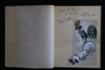 BOFA Gus – Zoo par Gus Bofa. Paris, Éditions Mornay ‘Collection Originale’ 1935, in-8° carré (20 x 25 cm) de 70 ff. non paginé, illustré de 72 lithographies en deux tons, dont une de couverture, une de titre et 70 à pleine page avec marges symphoniques en noir. Reliure à la Bradel plein papier vert de la couleur de la couverture conservée, dos légèrement insolé, frottis en tête. Reliure signée ‘Ad. Lavaux’. Édition originale au tirage limité à 1.210 ex. celui-ci sur vélin Navarre non justifié mais enrichi d’une lettre autographe signée adressée à « Mon Vieux… » dans laquelle il regrette de si peu le voir et lui demande son avis sur un lieu pour le Salon de l’Araignée avec « sa tendre et affectueuse amitié… » et d’un grand dessin gouaché représentant deux coqs avec cette dédicace au crayon gras « pour A D de S. (André Dunoyer de Segonzac) à toi mon vieux, affectueusement / Gus Bofa ». Admirable livre dans lequel GUS BOFA (1883-1968) critique de façon humoristique mais incisive l’humanité : « Je n’aime pas beaucoup les Hommes, mais j’ai beaucoup de tendresse pour les animaux (…) Ce n’est pas qu’ils vaillent mieux que l’Homme : ils sont, autant que lui, laids, sales, paresseux, voleurs, salaces, menteurs, obscènes et pleutres (…) Au vrai, je n’ai pas tellement souci de prouver aux Bêtes mon amitié, que de mériter la leur. J’ai besoin de me faire pardonner, par chacune d’elles en particulier, la muflerie millénaire de toute ma race à leur égard » (Préliminaire). André Dunoyer de Segonzac (1884-1974) est le contemporain et l’ami de Gus Bofa avec qui il fit ses classes au Lycée Henri IV. À propos du Salon de l’Araignée, Gus Bofa écrit : « Il n'a pas de programme esthétique ni de but social. Il en avait probablement un, lors de sa fondation, mais il a été égaré, et depuis on n'a jamais pu le retrouver. Il s'en passe fort bien ». Il rassemble certains des dessinateurs les plus originaux de leur temps, autour du livre illustré. Ces artistes, souvent passés par l'expérience traumatique du front n'ont d'autres maîtres que leur fantaisie, leur indépendance et leur choix de regarder au-delà des apparences. En 1935, Ad. Lavaux père fils, exerçaient 16 place Dauphine dans un atelier créé en 1876.