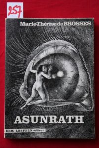 [SERRE (Claude)] - BROSSES (Marie-Thérèse de) – Asunrath. Illustrations de Claude Serre. Paris, Éric Losfeld ‘Le Terrain Vague’, 30 décembre 1967, in-8° (16 x 22 cm) br., couverture à rabats illustrée, de 190 pp.- 1f. avec 12 dessins hors-texte en noir. Édition originale sans grand papier. Exemplaire non coupé pour ce roman ‘érotique’ qui fit scandale non pour le texte mais pour plagiat ! Réf. : ‘Fiction’ 175 (VI-1968) - Gérard KLEIN : « …Éric Losfeld eut l'intelligence de relever ce conte de fées, narré très joliment, de l'épice des dessins de Serre qui lui donnent une profondeur ténébreuse. … Le livre de Marie-Thérèse de Brosses a connu une destinée assez étrange. Son ‘auteur’ fut en en effet convaincu de plagiat. Le manuscrit lui avait été ‘donné’ par un ami éditeur peu scrupuleux et elle l'avait proposé à Éric Losfeld qui, en toute bonne foi, l'avait accepté. Le véritable auteur était un homme âgé qui porta plainte et M.-Th. de Brosses fut condamnée. Mais les vraies victimes de cette malhonnêteté furent Claude Serre et Éric Losfeld puisque le livre dut être retiré de la vente et les exemplaires détruits ».