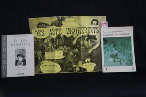 - CHARPIN (Catherine) – Les Arts Incohérents (1882-1893). Préface de François CARADEC. Paris, Syros édit. ‘Zigzags’ 1990, in-8° (16,5 x 22 cm) br., couv. rigide, de 128 pp. abondamment illustrées. On joint : ABÉLÈS (Luce) CHARPIN (Catherine) – Arts Incohérents, académie du dérisoire. Paris, Réunion des Musées Nationaux 1992, in-8° (17 x 24 cm) br., couverture rigide illustrée, de 96 pp. abondamment illustrées. Catalogue réalisé à l’occasion de l’exposition présentée au Musée d’Orsay du 25 février au 31 mai 1992. Et : Affichette invitation sur papier jonquille (42 x 29,5 cm.) à l’exposition des ‘Arts Incohérents 100 ans après…’ dans les salons du restaurant l’Intermède, rue St-Lazare dans le 9e (Jean-Paul PETIT), le vendredi 1er avril 1994. « Ancien membre des Hirsutes, Jules Lévy fonde les Arts incohérents en 1882… Par bien des aspects, cette ‘avant-garde sans avancée’ préfigurait plusieurs courants avant-gardistes du XXe siècle, notamment le dadaïsme ». Voir supra les nos 164, 165 166.