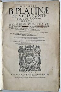 (Religion) - PLATINA, II.- Historia de vitis pontificum romanorum [...]. Coloniae, apud Maternum Cholinum, 1574. 3 parts in 1 vol. in-f° : [24]-429-[3 bl.], 104, 76-[28] pp. (slightly browned, some handwritten notes in the margins and corrections in...