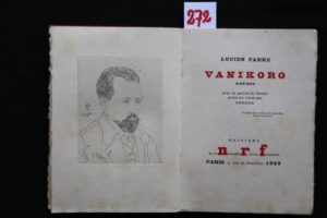 [FOUJITA] - FABRE (Lucien) – Vanikoro. Poèmes. Avec un portrait de l'auteur gravé sur cuivre par FOUJITA. Paris, NRF 1923, in-16 jésus (13,5 x 18,5 cm) broché, non-coupé, couv. rouge imprimée de 111 pp., des rousseurs. Édition originale, tirée à 515 ex., un des 500 num. sur Madagascar (n° 72). Édition originale, de la collection ‘Une œuvre, un portrait’, de ces poèmes dédiés à La Pérouse.