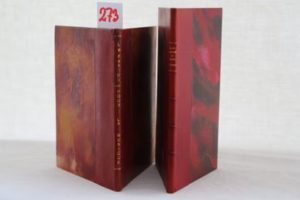 FARGUE (Léon-Paul) – Trois poèmes (1942). Paris, Textes Prétextes 1942, plaquette in-8° allongé (13 x 22 cm) de 24 pp.- 4 ff., reliée demi-chagrin rouge, dos à nerfs, titré or, couvertures conservées. Édition originale au tirage limité à 110 exemplaires ; celui-ci sur vélin de Rives (n° 54). Exemplaire sans défaut. La Porte, La Gare abandonnée, Les Compagnons expriment la mélancolie du ‘piéton de Paris’, imprimée sur les presses de DARAGNÈS, sous l’occupation. On joint : FARGUE (Léon-Paul) – Pour la musique Tancrède, suivi de Ludions. Paris, Gallimard ‘Métamorphoses’ 1943, plaquette in-8° (14,5 x 19 cm) de 60 pp.- 1f., reliée demi-chagrin rouge, dos lisse titré en long, couvertures conservées, charnière supérieure frottée. E. A. S. : « à Jean Dutourd, son ami qui chante, Léon Paul Fargue ».