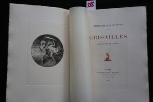 LA TOUR ET TAXIS Marie (Princesse Alex. de) – Grisailles. Illustrations de l’auteur. Paris, Henri Leclerc 1907, petit in-4° broché (21 x 29,5 cm) de 2 ff.- 132 pp.-1f., sous couverture imprimée or rempliée ; étui, dos de percaline beige avec pièce de titre marron, date en queue. Illustré de 18 compositions gravées à l’eau-forte et 6 lettrines tirées en sanguine. Édition originale au tirage limité à 325 ex., celui-ci sur Vélin à la forme, n° 64. Bel exemplaire sans rousseurs. Charmant ouvrage de la princesse qui sera la fidèle amie et mécène du poète Rainer-Maria Rilke.