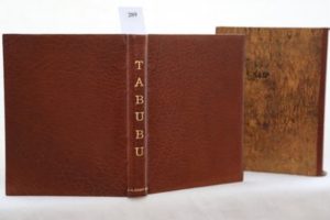 [LALAU (Maurice)] – ROSNY Aîné (Joseph-Henry) – Tabubu. Roman égyptien. Paris, Jules Meynial [1932], in-12 carré (148 x 186 mm) de 2ff. bl.- 3ff.- 112 pp.- 4 ff.- 2ff. bl. Illustré de 71 compositions de Maurice Lalau dont 10 à pleine page tirées en camaïeux de gris, brun, sable, rose et beige, ou en demi-teinte de bleu, et rehaussées à l'or ou au palladium. Tirage limité à 110 exemplaires tous sur Vélin de Madagascar (n° 21). Relié plein maroquin havane, dos lisse titré en long, gardes doublées et bordées du même maroquin, tête dorée, petites piqûres sur barbes, étui bordé. Bel exemplaire dans une reliure signée d’O. Saulin. Réf. : Carteret IV-349 « Remarquable illustration tant pour ses compositions que par la qualité de son impression. Elle est cotée », Monod 9940, Osterwalder ‘Dictionnaire des illustrateurs’ 650-651. Première édition illustrée de ce roman publié pour la première fois en 1894. Commencée en 1928 et imprimée en 1932, son intérêt réside autant dans la qualité de son illustration que dans celle de son impression réalisée par LALAU lui-même dans son atelier, avec la collaboration de Raymond JACQUET. Le papier Madagascar, comme le papier Japon, se marie idéalement aux rehauts d’argent et d’or, et sert parfaitement l'élégante typographie en brun et rouge de Marthe FÉQUET. L’un des plus beaux livres Art-Déco.
