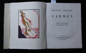 MÉRIMÉE (Prosper) - HERMANN-PAUL – Carmen. Bois en couleurs d’Hermann-Paul. Paris, La cité des livres 1927, in-4° br. couverture rempliée et étui de papier coquille (24 x 30 cm) de 105 pp.- 4 ff. illustrées de 13 bois en couleurs dont 5 en hors-texte. Tirage limité à 290 exemplaires, un des 220 num. sur vélin de Hollande (n° 101). Bel exemplaire, sans rousseur.
