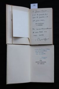 ROCHEFORT (Christiane) – Les Enfants du siècle. Paris, Grasset 1961, in-12 (12 x 19 cm) broché, couv. imp. de 206 pp.- 1f.. non coupé. Édition originale, un des 30 ex. hors commerce numéroté sur Vélin pur fil (n° XXII), seul grand papier ; Envoi autographe signé : « À mon cher Raymond Queneau dont j’ai subi l’influence mais pas assez, avec mon admiration… ». On joint : ROCHEFORT (Christiane) – Les Stances à Sophie. Paris, Grasset 1963, in-12 de 244 pp.- 2ff., relié à la Bradel pleine percaline noisette, pièce de titre marron, couv. et dos conservés ; reliure signée ‘G. Gauché rel. Paris’. Édition originale, sur Vélin pur fil non justifié avec, sur le faux-titre, cet envoi autographe signé : « À Gérard Bauër, c’est le premier qui sort des presses, il est pour vous. Très inconditionnellement et avec toute ma vraie amitié… » et sur le verso de la page de garde : « Je vous embrasse… ». Montée sur onglet une carte de visite de Christiane Rochefort : « Je ne vais pas vous téléphoner, mais vous vous pouvez à PYR.04.15 désormais. Amitiés… ». Ex-libris de Gérard Bauër, petit-fils naturel d’Alexandre Dumas père. « Je ne saurais faire attendre l'hommage de sympathie et d'estime dû au meilleur des confrères, à celui qui maintenait en notre temps, dans sa dignité et sa perfection, le type de l'homme de lettres. …Nous ne recevrons plus ses billets concis, aussi élégamment calligraphiés que sûrs dans le choix des mots » (de Pierre-Henri SIMON, 1967).