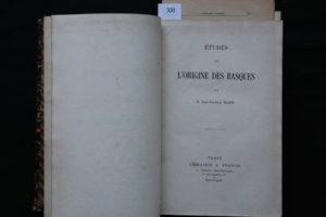 BLADÉ (Jean-François) – Études sur l'origine des Basques. Paris, Franck 1869. In-8° de 3ff.- iv-549 pp. + 1 pl. hors texte. Relié demi-basane cognac, dos à nerfs surlignés de filets or et à froid, fleurons entre, pièce de titre rouge. 3 brochures en fin d’ouvrage : Boudard, Notes sur l’ouvrage de M. Bladé (17 p.). Bladé, Défense des études sur l’origine des Basques (16 p.) Et, un « Carton destiné à remplacer une partie des pages 405 à 412 où la critique avait signalé quelques opinions contestables ». Réf. : Dendaletche I-226 « Assez rare », Vinson 402.