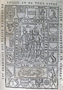 Première édition anversoise (éd. orig. en latin : 1576, éd. orig. de la trad. : Lausanne, 1577) illustrée d'un bois à pleine page, cerné des armoiries cantonales, figurant trois personnages emblématiques suisses : Arnold de Melchtal d'Unterwald, Werner Stauffacher et Guillaume Tell. Traite des batailles, alliances et "autres gestes mémorables" depuis Raoul de Habsbourg jusqu'à Charles Quint. # Machiels S-343; # Adams S-1170; # BT 4355.