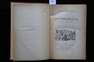 ESCUDIER (Gaston) – Les Saltimbanques. Leur vie, leurs mœurs. 500 dessins à la plume par P. de Crauzat. Paris, Michel Lévy frères 1875, in-8° (18 x 25 cm) de 3ff.- 480 pp. avec 500 dessins in et hors texte. Reliure moderne à la Bradel pleine toile prune avec collé sur le plat supérieur la toile du cartonnage éditeur d’origine décorée par Souze, toutes tranches dorées. Réf. : Vicaire III-591.