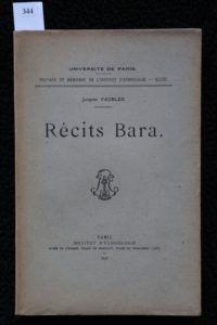 FAUBLÉE (Jacques) – Récits Bara. Paris, Institut d'Ethnologie 1947, grand in-8° (18 x 28.5 cm) broché de 2ff.- 537 pp.. Édition originale. Bon exemplaire, état neuf non coupé. Les premières missions de Jacques Faublée (1912-2003) le mènent dans l’Aurès algérien, avec Thérèse Rivière et Germaine Tillion entre 1935 et 1937. Loin des procédés pratiqués durant la mission Dakar-Djibouti (1931-1933), ils utilisent des méthodes modernes de terrain développées par Bronislaw Malinowski : l’observation participante, en vivant parmi les populations qu’ils étudient. « Les récits qui suivent ont été notés dans les villages mêmes des conteurs sans utiliser d’informateur transplanté, sans co-enquêteur non bara … » (Introduction). Sa vision singulière en ethnologie contribue à faire de ces travaux des œuvres majeures, en particulier sur les sociétés Bara et Vezo.