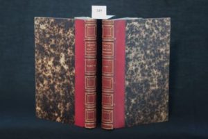 GÉNIN (François) – Récréations philologiques ou Recueil de Notes pour servir à l'histoire des mots de la langue française. Paris. Chamerot 1856, 2 vols. in-8° (14,5 x 22 cm) de xxix- 464 pp. + 1f.- 447 pp., en reliure d’époque demi-chagrin rouge, dos à nerfs ornés de filets or formant caissons à la Duseuil, toutes tranches jaspées. Des rousseurs. Première édition. Dernier ouvrage de ce romaniste du langage. Sensualiste, François Génin (1803-1856) est contre le purisme rationaliste et appelle à la libération du langage du joug des grammairiens : « Il est urgent de retremper notre langue à ses sources antiques et populaires, si nous voulons sauver son génie agonisant ».